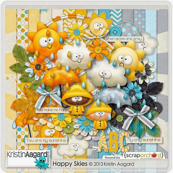I also have added to a very small Scrap Orchard collaboration contribution I made early this year to create this fun, bright mini kit, Happy Skies. You may already have a very small portion of Happy Skies from the Scrap Orchard Collab that was available for a short time this spring. I have added some fun little characters, elements and papers to create this kit. Pick it up for only $1 during the sale!