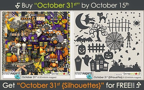I really enjoy designing Halloween kits! The characters and themed elements are so fun to create! And I just love the colors!! I have a brand new Halloween themed digital scrapbook kit available this week called “October 31st”. It is 20% off this week during Fresh Fruit HERE at Scrap Orchard. Plus, if you buy “October 31st” by October 15th, you’ll get the October 31st {Silhouettes} for free!
