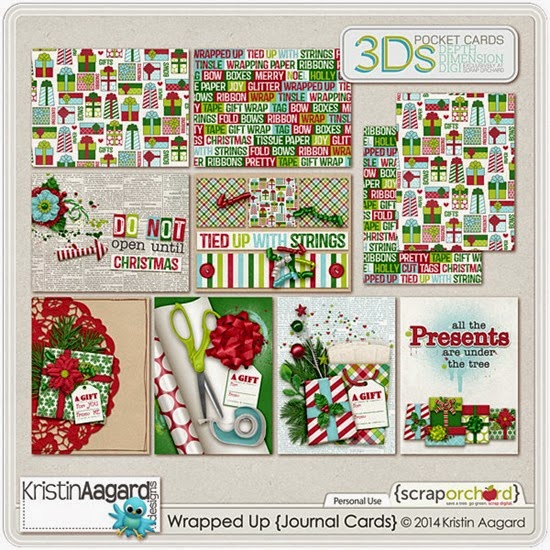 My kids are old enough this year to join in the holiday preparations! I thought it would be fun to have a kit to scrap the photos of my family wrapping their holiday gifts! Wrapped Up is the perfect kit for that! It includes lots of gift wrapping elements like scissors, tape, gift bows and wrapping paper and lots and lots of festive holiday scrappy elements, words and papers. Wrapped Up is 20% off through December 24th HERE in my store. If you purchase the kit while it is still on sale, you’ll get the Wrapped Up Journal Cards for free!